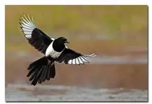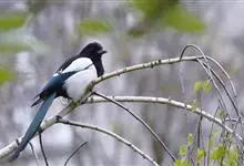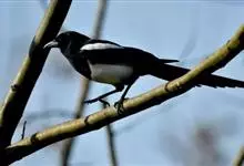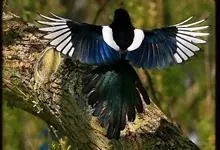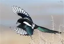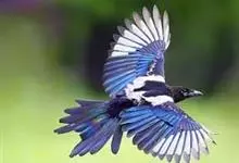 喜鹊:是鸦科、鹊属的一种鸟类。共有11个亚种。体长40-50厘米,雌雄羽色相似,头、颈、背至尾均为黑色,并自前往后分别呈现紫色、绿蓝色、绿色等光泽,双翅黑色而在翼肩有一大形白斑,尾远较翅长,呈楔形,…全部>>