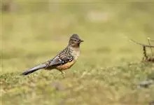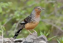 大噪鹛:中型鸟类,体长32-36厘米。额至头顶黑褐色,背栗褐色满杂以白色斑点,斑点前缘或四周还围有黑色。初级覆羽、大覆羽和初级飞羽具白色端斑。尾特长,均具黑色亚端斑和白色端斑。颏、喉棕褐色,…全部>>