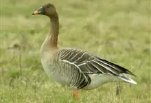 豆雁,雁形目鸭科。成鸟头、颈、背灰褐色,带淡黄色羽缘;尾上覆羽白色,尾羽黑褐色带白端,故飞行伸展时可见尾基和尾端各有一条白色弧线;翼上覆羽灰褐色,初级覆羽深黑灰色带黄白色羽缘,…全部>>