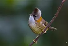 纹喉凤鹛:小型鸟类,体长13-16厘米。头顶和羽冠暗褐色或褐灰色,上体橄榄褐色,飞羽黑褐色,外侧次级飞羽表面橙黄色,构成一块纵形翼斑,极为醒目。颏、喉淡棕白色,具黑色纵纹,腹和尾下覆羽橙黄色。…全部>>