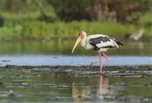 彩鹳:鹳科、鹮鹳属的鸟类。体长93-102厘米,体重2-3.5千克。橙黄色的嘴粗而长,但嘴尖稍微向下弯曲。脚为红色,也特别长,胫的下部裸出。橙色的头部赤裸无羽,繁殖期变为红色。体羽主要为黑色和白色,…全部>>