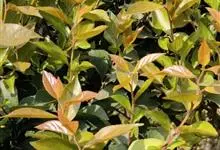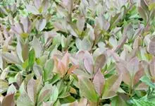 红叶石楠 是蔷薇科,石楠属杂交种,为常绿小乔木或灌木,乔木高可达5米、灌木高可达2米。叶片革质,长圆形至倒卵状、披针形,叶端渐尖,叶基楔形,叶缘有带腺的锯齿,花多而密,复伞房花序,花白色,梨果黄红色,…全部>>