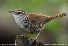鹪鹩属:是一类小型鸣禽,身长在10-17厘米之间。头部浅棕色,有黄色眉纹;上体连尾带栗棕色,布满黑色细斑;两翼覆羽尖端为白色。整体棕红褐色,胸腹部颜色略浅,翅膀有深色波形斑纹,嘴长直而较细弱,先端稍曲,…全部>>