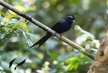 发冠卷尾是中型鸟类,体长28-35厘米。通体绒黑色缀蓝绿色金属光泽,额部具发丝状羽冠,外侧尾羽末端向上卷曲。栖息于海拔1500米以下的低山丘陵和山脚沟谷地带,多在常绿阔叶林、次生林或人工松林中活动。…全部>>