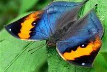 枯叶蛱蝶,又名木叶蝶、树叶蝶等,属于蛱蝶科。翅正面黑褐色,具深蓝色光泽,前翅顶角尖出,顶区有1枚小白点,中部有1条倾斜的橙色斑带,从前缘延伸至Cu室外缘,u室中部有1枚黑色圆斑,…全部>>