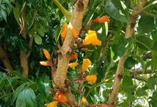炮仗藤 Miers)紫葳科炮仗藤属藤本植物。小枝顶端有丝状卷须;叶对生,卵形;花萼钟状,橙红色,长椭圆形,花丝丝状,花药叉开;果瓣为革质,舟状。花期1-6月。初夏红橙色的花朵累累成串,状如鞭炮,…全部>>