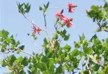 鸡冠刺桐是豆科、刺桐属落叶灌木或小乔木,茎和叶柄稍具皮刺。羽状复叶具3小叶;小叶长卵形或披针状长椭圆形,花与叶同出,总状花序顶生,每节有花1-3朵;花深红色,荚果长约15厘米,褐色,种子间缢缩;种子大,…全部>>