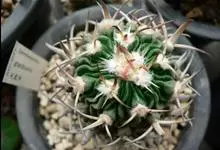 龙王球 E.F. Anderson)是仙人掌科瘤玉属植物。茎球形至短圆筒形,高15-30厘米,径8-12厘米,浓绿色,顶部凸起,13棱,棱脊高白色带褐晕,刺座排列密。花冠漏斗状,着生茎顶部,花多数,…全部>>