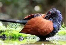 褐翅鸦鹃,是鹃形目鸦鹃科鸦鹃属的鸟类。褐翅鸦鹃的身体为黑色;头颈和胸带蓝紫色金属光泽并具黑亮的羽干纹,下胸至腹部泛金属绿光泽;两翼和肩部为棕栗色,外侧飞羽具暗色羽端,尾羽闪铜绿色光泽;虹膜赤红色,…全部>>