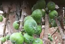 大果榕是桑科榕属的小乔木,株高可达10米;幼枝被柔毛;叶互生,宽卵状心形或近圆形;雄花无梗、匙形、花丝长,雌花生于雌株榕果内,子房白色;榕果簇生于树干基部或老茎短枝上、扁球形或陀螺形,…全部>>